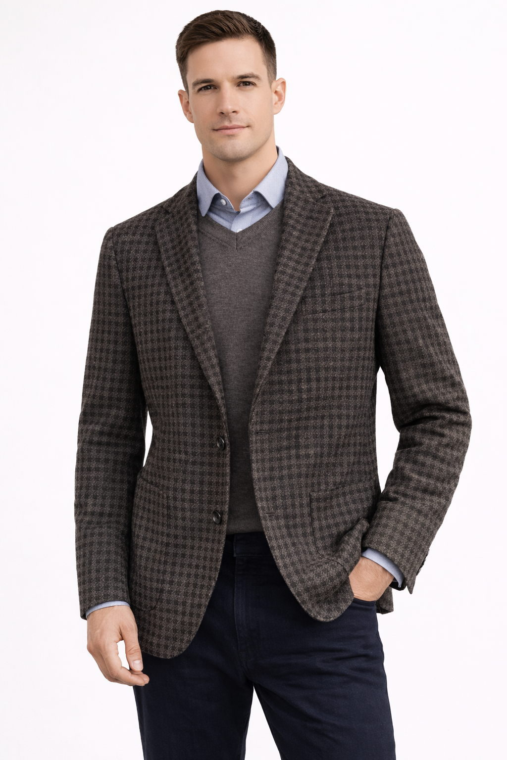 B9690-01 - A blended wool Houndstooth Blazer, a Classic Look. Knitted for incredible Comfort Black & brown